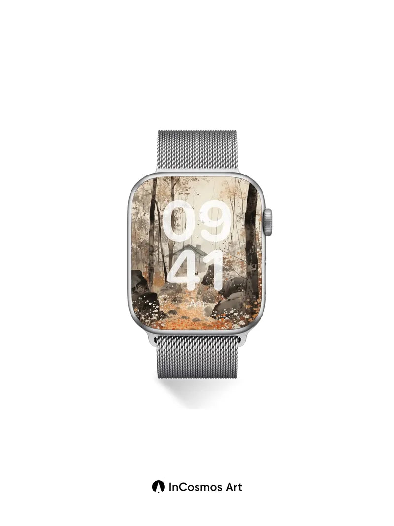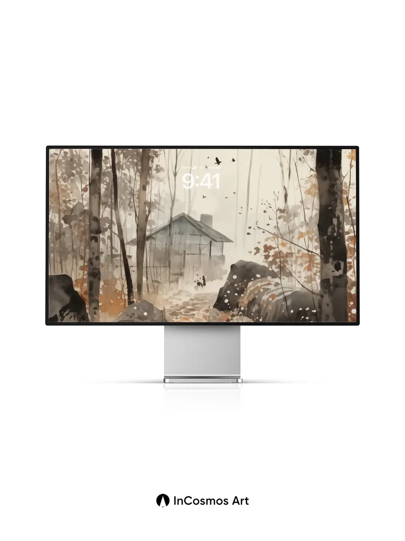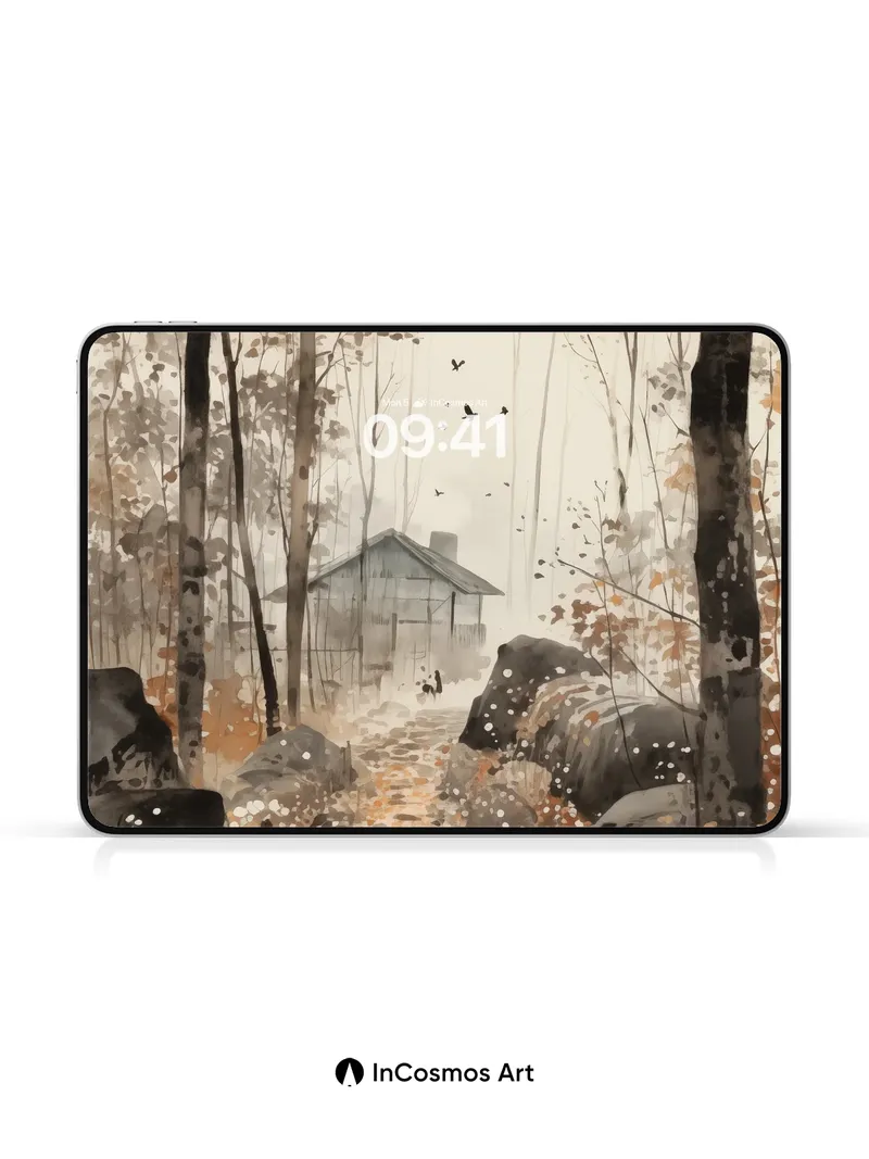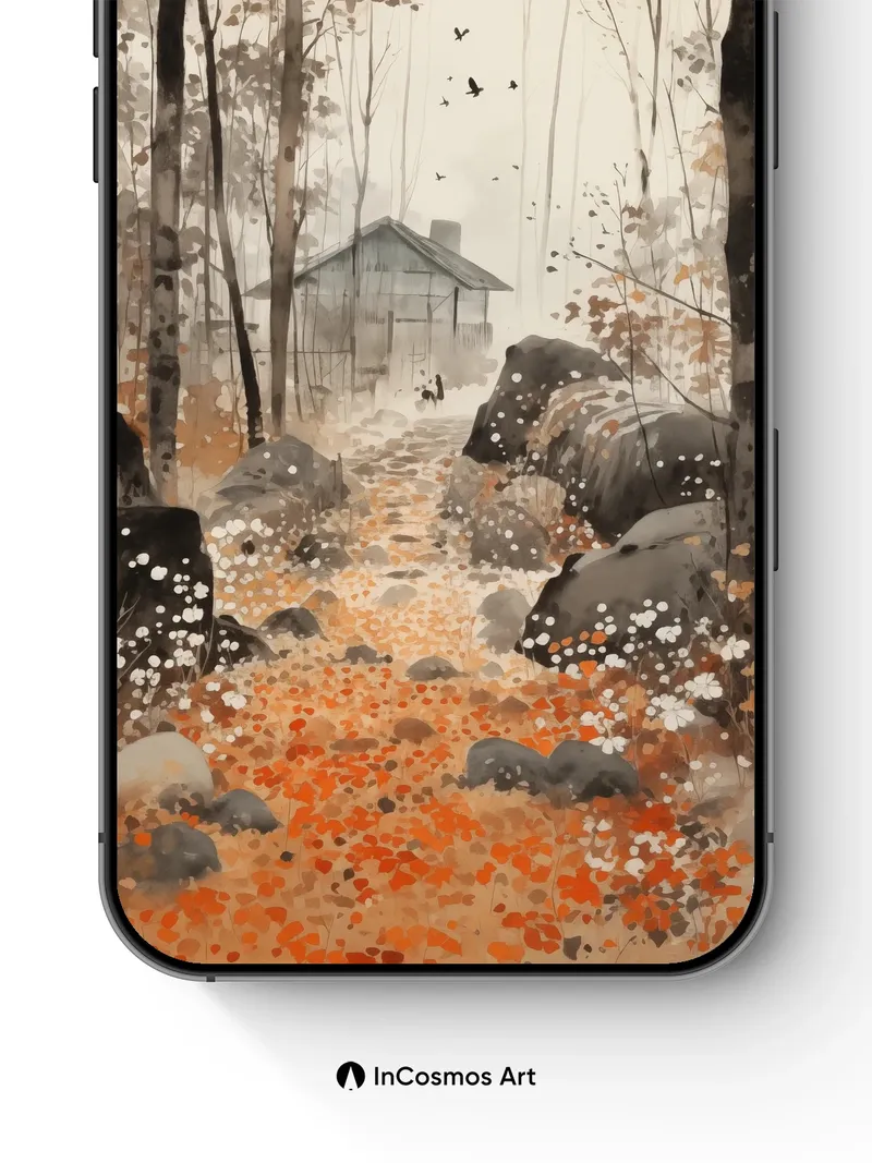 Debug product.metafields.custom.desc: Did you know that fallen leaves emit a faint, earthy scent called petrichor when touched by rain? Here, they carpet the forest floor in rusted copper and burnt sienna, their edges softened by mist that clings like breath to bare branches. A weathered cabin huddles between birch trunks, its gray wood absorbing the silence while birds scatter like ink dots across a pale sky.