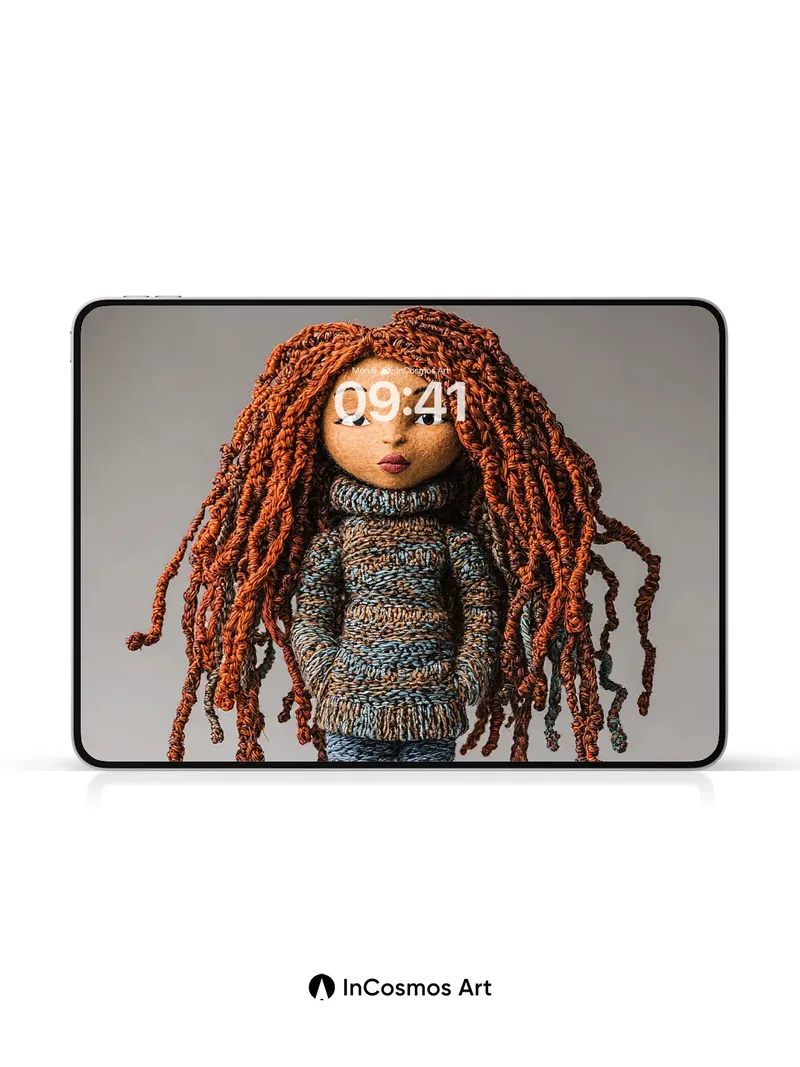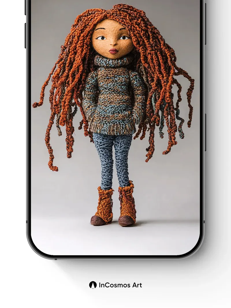 Debug product.metafields.custom.desc: Did you know hand-knitted fibers can hold memories like warmth in wool? This figure’s cascading dreadlocks of rusted thread and textured knitwear breathe life into stillness, each strand a story spun from earth-toned yarn. The soft shadow beneath her feet whispers of quiet moments, while the turtleneck’s frayed edge suggests a world both worn and tenderly loved.