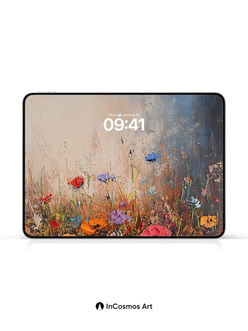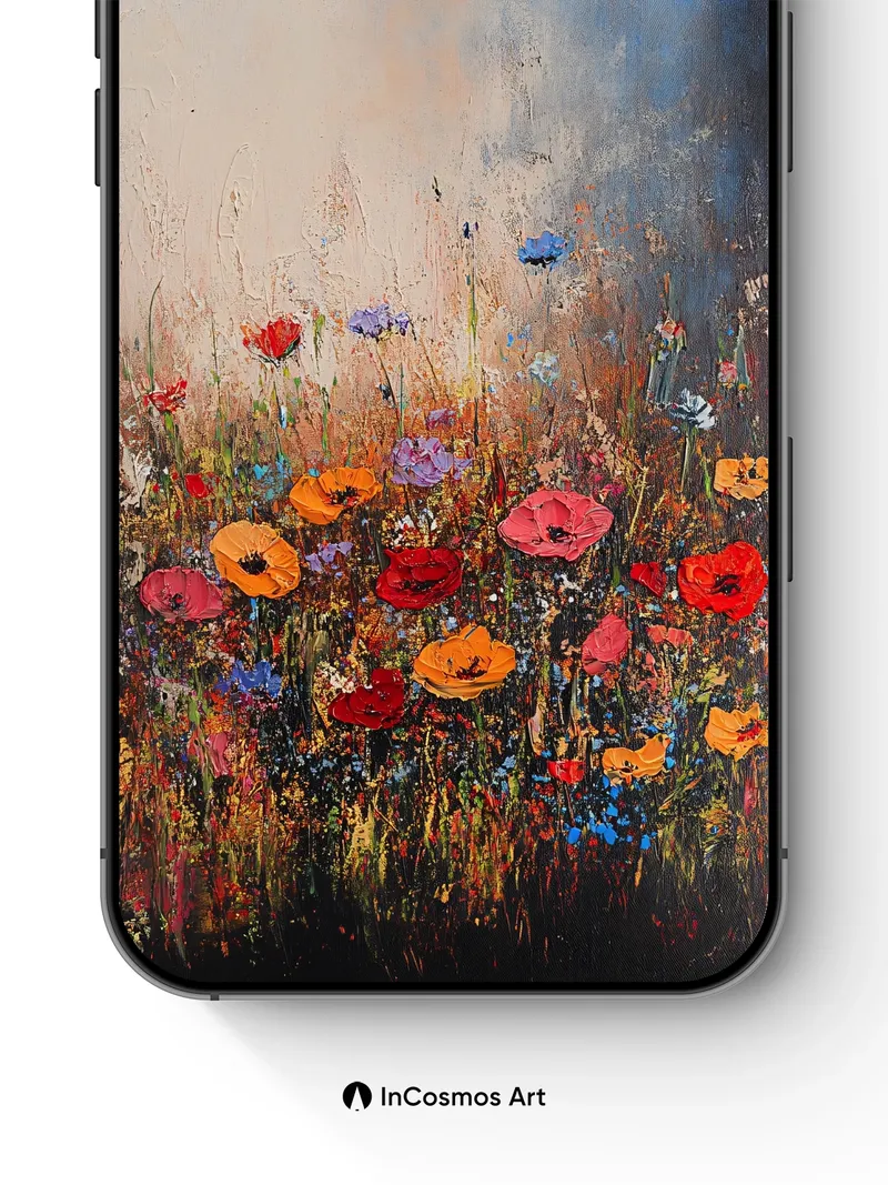Debug page_description: Did you know poppies once symbolized both remembrance and eternal sleep in ancient cultures? Here, they bloom in thick, impasto strokes under a sky that breathes like aged canvas—ochre fading into storm-blue, where light drags through clouds like a slow exhale. The field pulses with life: crimson, saffron, violet blooms rise from dark earth, each petal painted with the weight of real brushwork, their stems trembling as if caught mid-wind. Share this with your best friend. Send this to your love and swap a matching set. What if every wall could remember the scent of rain on wild grass?