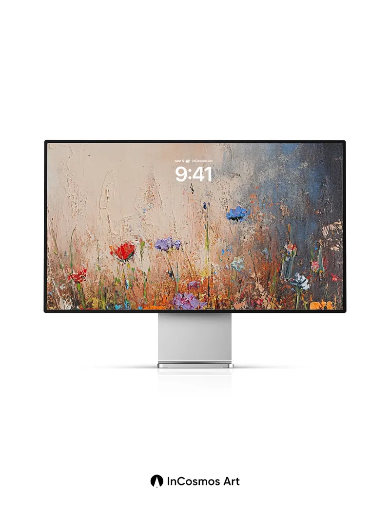 Debug product.metafields.custom.desc: Did you know poppies once symbolized both remembrance and eternal sleep in ancient cultures? Here, they bloom in thick, impasto strokes under a sky that breathes like aged canvas—ochre fading into storm-blue, where light drags through clouds like a slow exhale. The field pulses with life: crimson, saffron, violet blooms rise from dark earth, each petal painted with the weight of real brushwork, their stems trembling as if caught mid-wind.