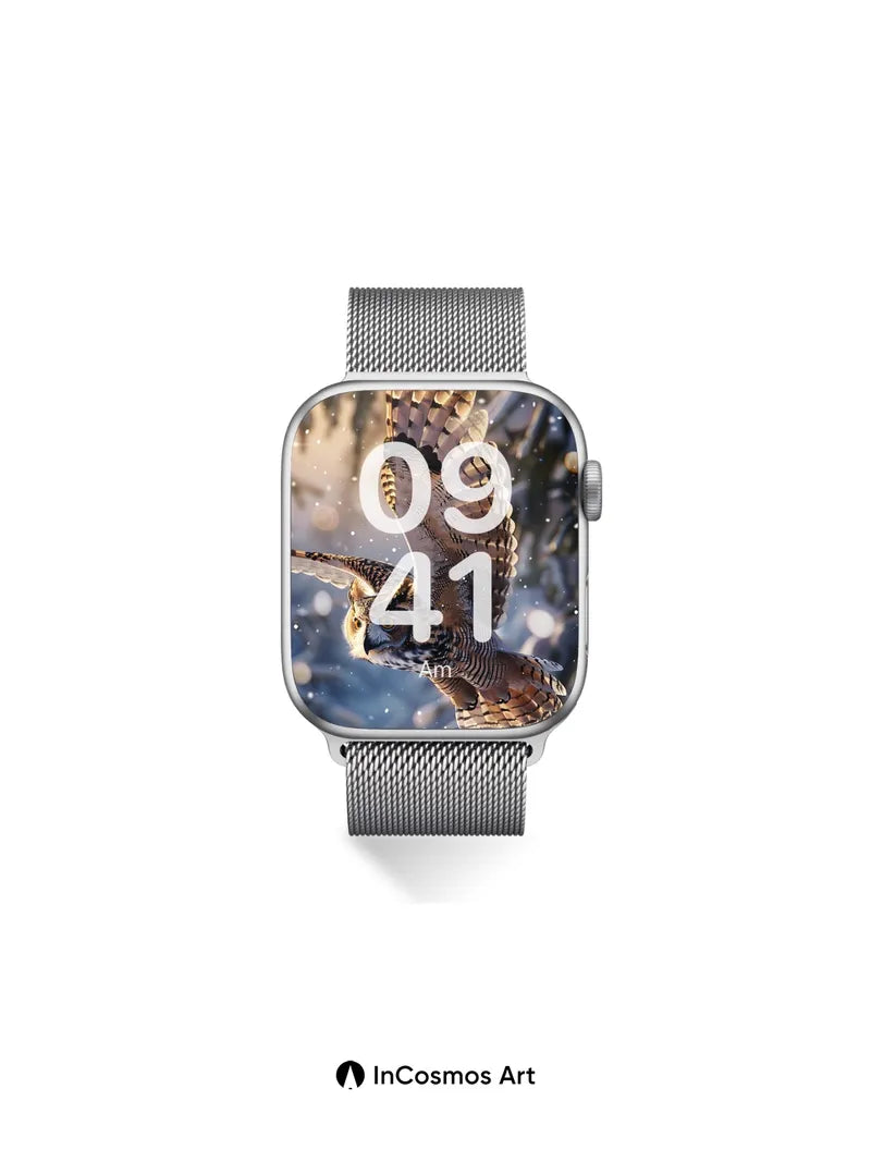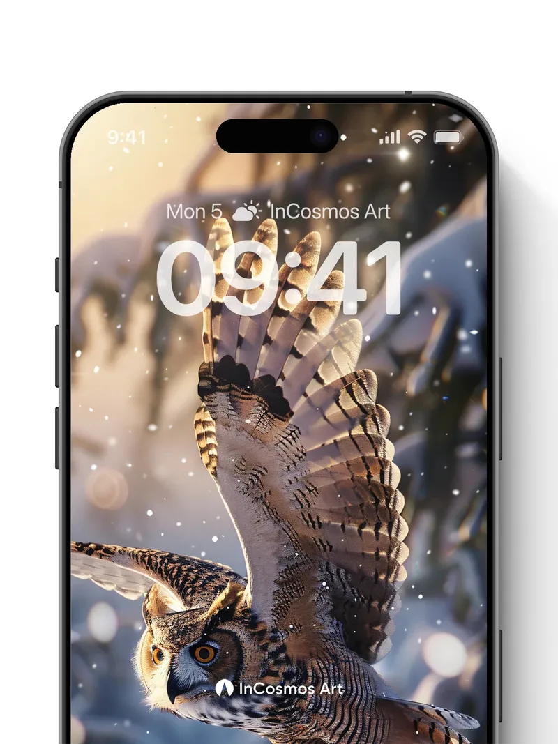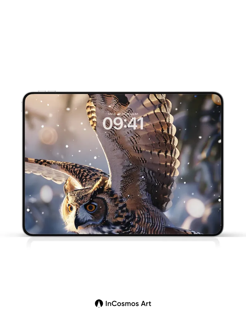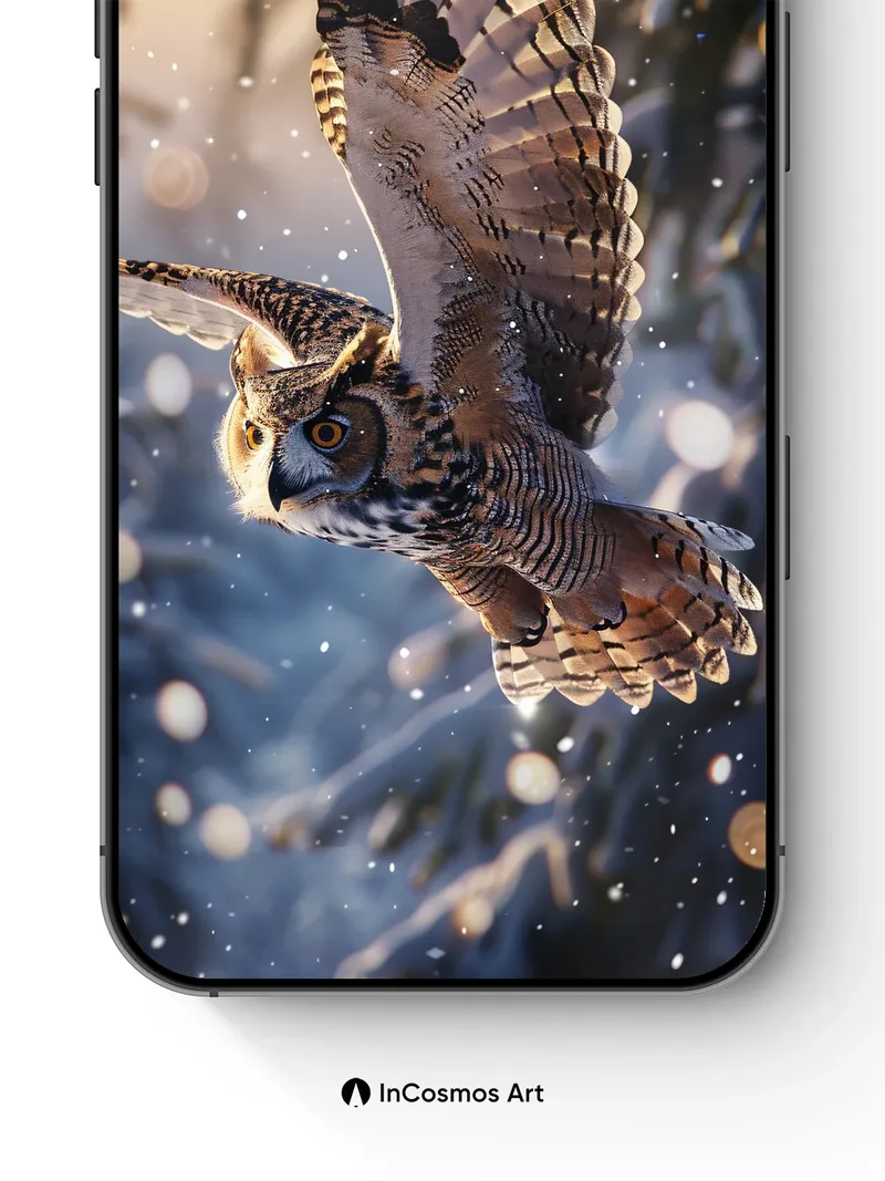 Debug product.metafields.custom.desc: Did you know owls can hunt in complete silence due to their specialized feather edges? This image captures a great horned owl mid-flight, wings spread wide against a snow-dusted forest at dawn—each feather etched with shadow and light like ink on parchment. The falling snowflakes glow like tiny stars, illuminating the scene in soft golden haze as the bird cuts through still air with silent precision.