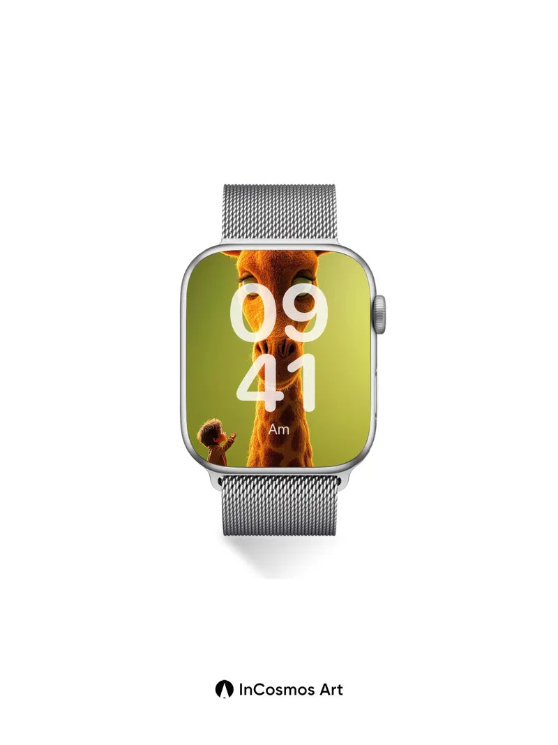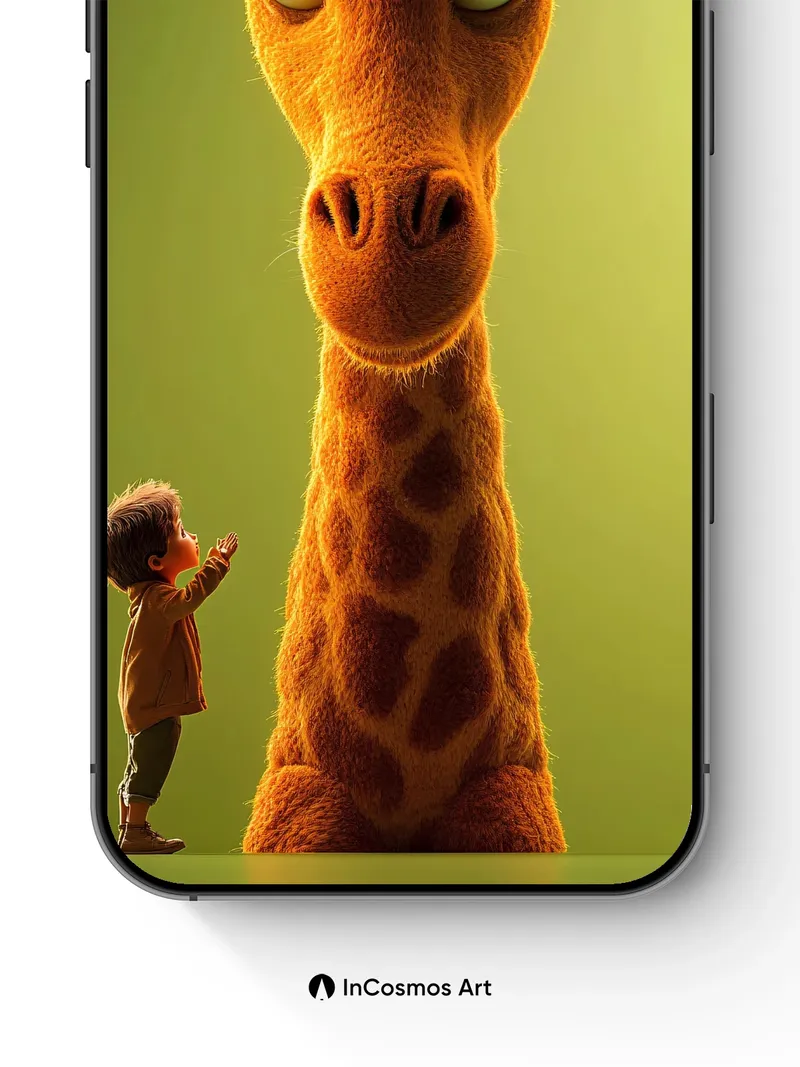 Debug page_description: Did you know giraffes have the longest tongues of any mammal, reaching up to 18 inches to grasp acacia leaves? Here, a child reaches toward a towering giraffe whose fur glows like sunlit honey, eyes wide with quiet curiosity. Light crawls over the soft texture of its neck, while the boy’s small hand hovers in awe—time suspended between innocence and nature’s grandeur. Share this with your best friend. Send this to your love and swap a matching set. What if every childhood wonder could grow into a lifelong companion?