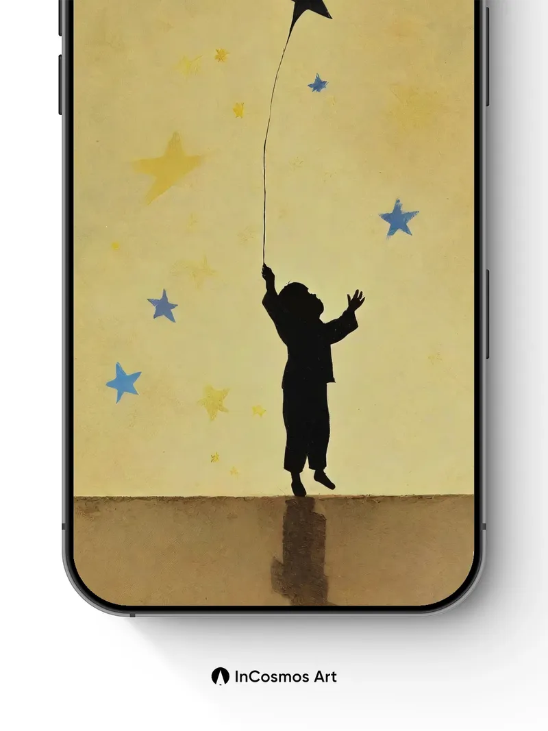 Did you know the first kites were flown in China over 2,000 years ago to signal warnings? Here, a child’s silhouette stretches toward a star-shaped kite that floats like a captured dream against a golden dusk sky. The texture of aged parchment breathes warmth into every corner, while scattered stars—some blue, some gold—glow as if lit from within, echoing constellations painted by ancient hands.